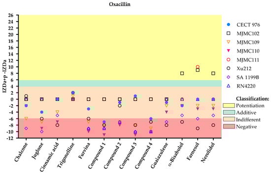 Inhibition zone diameter (IZD) values (mm) and respective classification according to the combined application of the selected phytochemicals and methicillin against the eight different S. aureus strains. The effect of dual combinations of antibiotics and phytochemicals was classified as potentiation when IZDa+p–IZDa ≥ 6 mm (yellow zone), additive when 6 mm > IZDa+p–IZDa ≥ 4 mm (green zone), indifferent when 4 mm > IZDa+p–IZDa > −6 mm (light pink zone) and negative when IZDa+p–IZDa ≤ −6 mm (dark pink zone), where IZD corresponds to the inhibition zone diameter, a = antibiotic and p = phytochemical. Compound 2, a nitrovinylfuran derivative, induced total growth inhibition against the RN4220 strain. More detailed information about the interactions is given in the Supplementary Materials, including some geometric shapes that might be overlayed on the graph (Table S1).
