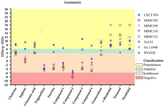 IZD values (mm) and respective classification according to the combined application of the selected phytochemicals and gentamicin against the eight different S. aureus strains. The effect of dual combinations of antibiotics and phytochemicals was classified as potentiation when IZDa+p –IZDa ≥ 6 mm (yellow zone), additive when 6 mm > IZDa+p–IZDa ≥ 4 mm (green zone), indifferent when 4 mm > IZDa+p–IZDa > −6 mm (light pink zone) and negative when IZDa+p–IZDa ≤ −6 mm (dark pink zone), where IZD corresponds to the inhibition zone diameter, a = antibiotic and p = phytochemical. Compound 2, a nitrovinylfuran derivative, induced total growth inhibition against the RN4220 strain. More detailed information about the interactions is given in the Supplementary Materials, including some geometric shapes that might be overlayed on the graph (Table S1).