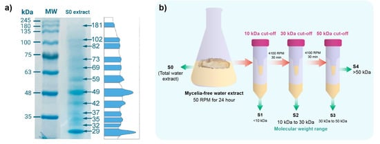 (a) SDS-page electrophoresis of the mycelia-free extract (S0) and (b) scheme of molecular weight fractionation of mycelia-free aqueous extract to synthesize AgNPs using Amicon ultra tubes. S0 to S4 indicate fractions used for the synthesis of AgNPs.