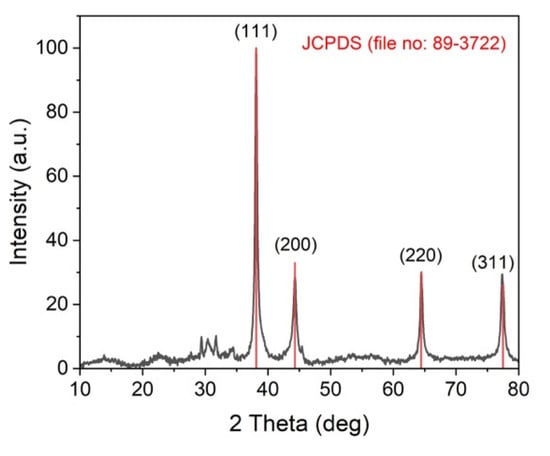 XRD analysis was used to corroborate the formation of the AgNPs by the mycelia-free extract of S. hirsutum (Figure 2). The diffraction peaks observed at 38.11°, 44.27°, 64.42°, and 77.48°, corresponding to (111), (200), (220), and (311) of the face-centered cubic structure of metallic silver, matched with the reference of the FCC structure of the Joint Committee of Powder Diffraction Standard (JCPDS file no. 89-3722) from PDF-2 database. The XRD spectra also exhibited the presence of an additional peak before 30°, which might be due to the presence of organic compounds in the sample [].