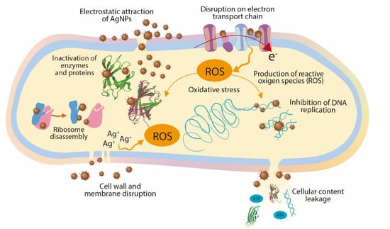 To understand the antimicrobial activity of the AgNPs, three modes of action have been proposed: (1) cell wall and membrane damage, (2) intracellular penetration and damage, and (3) oxidative stress []. The cell wall of Gram-negative bacteria such as P. syringae contains at least two lipopolysaccharide layers that protect the bacteria against environmental threats, maintain cell homeostasis, and transport nutrients inside the cell. The AgNPs release Ag+ ions which damage the cell wall and membrane, increasing their permeability; as a result, the cellular contents (proteins, enzymes, DNA, ions, and other metabolites) are released into the environment [,]. In addition, the AgNPs can also penetrate the periplasmic space and ultimately be inside the cell, where they can cause inhibition of DNA replication, inactivation of proteins and enzymes, disassembly of ribosome units, and oxidative stress, affecting crucial and vital cell functions []. Figure 5 shows a schematic representation of the main mechanism involved in the antimicrobial activity of AgNPs.