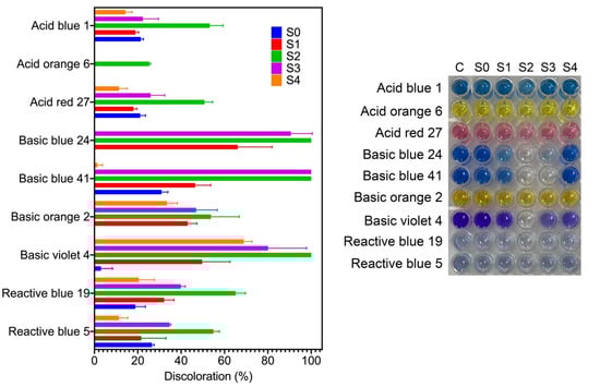 Each dye solution’s UV-vis spectra (range 400 nm to 700 nm) were measured before the discoloration assays to obtain the maximum absorption wavelength (λmax). The discoloration assays were performed in 96-well ELISA microplates with three acid dyes, four basic dyes, and two reactive dyes at concentrations shown in Table 2, the absorbance of which at λmax was close to 1.0 and 500 mg L−1 of Ag nanoparticles. The microplates were exposed to direct sunlight for two hours. The absorbance value at λmax for each dye was measured at zero and two hours. The percentage of dye discoloration was calculated using Equation (1):