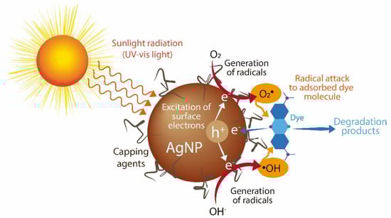 Other applications of AgNPs underscore the photocatalytic discoloration of toxic chemical dyes generated in effluent by the textile, plastic, paper, and pharmaceutical industries []. Biological synthesized AgNPs under sunlight, UV light radiation, and NaBH4 have shown catalytic activity in the degradation of synthetic dyes (methylene blue, methyl orange, rhodamine b, and malachite green, among others) and dye effluents [,,]. Although the effect of capping and stabilizing agents of biological reduction of silver on photocatalytic activity of AgNPs is not clear, the capping agents can enhance the interaction of the dye on the nanoparticle surface []. Furthermore, capping agents could positively affect the photocatalytic activity of nanoparticles since they impede the overgrowth and aggregation of nanoparticles [].