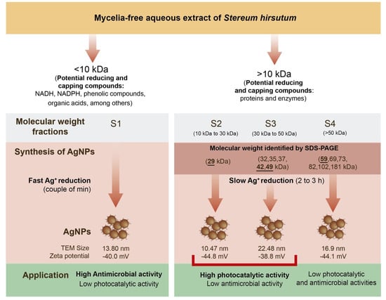 The present work was focused to identify the molecular weight of compounds that participate in the synthesis of AgNPs by the extract of the white-rot fungus, Stereum hirsutum, and their effect on antimicrobial activity and photocatalytic discoloration of synthetic dyes. For this purpose, the mycelia-free aqueous extract of S. hirsutum was separated into four molecular weight fractions (S1: <10 kDa, S2: 10 to 30 kDa, S3: 30 to 50 kDa, and S4: >50 kDa), which were used to synthesize AgNPs.