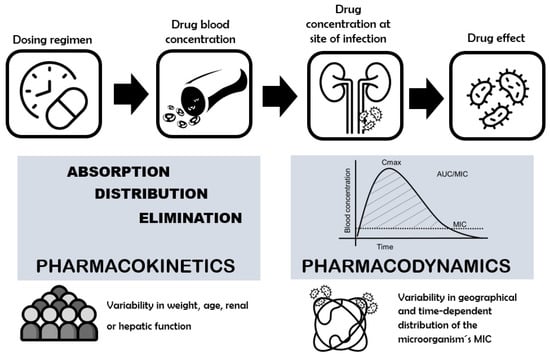 Optimally dosing FQs is dependent on several factors, such as pathophysiological characteristics of the patient, the infecting organism, the site of infection, and the pharmacokinetic/pharmacodynamic (PK/PD) properties of the drug (Figure 1). PK properties include the factors affecting drug absorption, distribution, metabolism, and elimination, which determine its concentration in the body. Physiopathological factors associated with the patient may be responsible for the interindividual variability of the PK processes. PD describe the mechanism by which the drug exerts its antimicrobial effect [,]. Interregional and time-dependent differences in MIC distribution values are responsible for the PD variability of the antibiotic. Careful consideration of the factors affecting PK/PD should allow for selection of the most appropriate antibiotic when treating urological infections and establishing the dosage with a better risk/benefit ratio in terms of efficacy, safety, and development of resistances [,,,]. The interindividual variability in PK/PD processes is likely to be one of the main contributors to the variability in the antibacterial dose-exposure response relation [,].