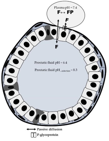 Specifically, FQs are effective in the treatment of many types of urological infections and other systemic infections due to their ability to achieve high concentrations in tissues and body fluids and their wide antibacterial spectrum. However, several complex mechanisms are involved in the penetration of special tissues, such as prostate. In addition to passive diffusion [], conditioned by the drug’s acidic or alkaline nature, its pKa, and the pH of prostatic fluid, there is evidence of the involvement of efflux transporters–primarily P-glycoprotein–on FQs tissue penetration (Figure 2).