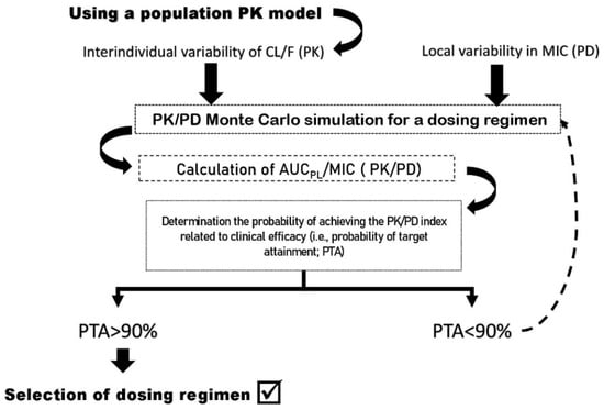 - Trang, M.; Dudley, M.N.; Bhavnani, S.M. Use of Monte Carlo simulation and considerations for PK-PD targets to support antibacterial dose selection. Curr. Opin. Pharmacol. 2017, 36, 107–113. [Google Scholar] [CrossRef]