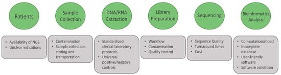Although it has been shown to have a promising potential to uncover the “unknown” origin of a disease, it has several obstacles and potential pitfalls when it is applied in the clinical routine, including availability, cost, human resource, and current validity (Figure 1). Indeed, the NGS machine is commonly found in the research laboratory. However, the machine commonly found in the clinical microbiology laboratory might not be an NGS machine. Hence, antibiotic resistance determination relies on the conventional methodology. The workflow of the examination, from sample collection to obtaining the sequencing result, needs to be carefully executed and requires highly trained molecular biology staff. After obtaining the sequence, user-friendly bioinformatics software for the analysis of NGS sequence data is not currently available. Thus, customized bioinformatic pipelines for analyzing clinical NGS data, such as Kraken [] or SURPI [], still require highly trained programming staff to develop, validate, and maintain the pipeline for clinical use. In addition, the generated data require a server-class level of computer for computational analysis. Altogether, these will massively increase the cost of examination. In the pathogen detection scenario, the cost for covering the examination is approximately USD 2000–3000 per sample; with this cost, it is easily marked up to >USD 10,000 per charge, which is ridiculously expensive compared to the offered advantages []. These challenges might be reduced in the future as the availability of the machine, together with its reagents and highly trained staff, rapidly increases.