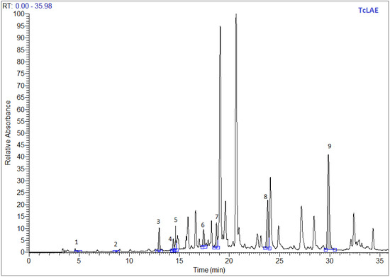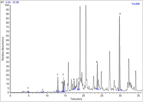 LC–MS chromatogram of phenolic compounds in the acetonic extracts of Thymus capitatus, as leaves detected at 280 nm.