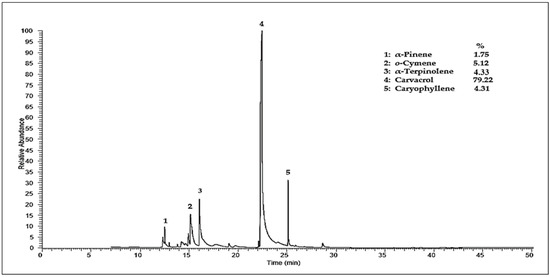The GC-MS chromatogram of TcLEO has recorded a total of 10 peaks (Figure 3) corresponding to 10 biomolecules (Table 3) that were recognized by relating their peak retention time, peak area (%), and mass spectral fragmentation patterns to that of the known compounds described by the NIST2014 library. The confirmation of the identified peaks was based on their retention indices relative to alkanes with those of authentic compounds and comparison with the retention indices values in the NIST online database of the corresponding compounds. Using these approaches allowed us to identify up to 99.5% of the total of the TcLEO. Carvacrol (79.22%) was the main compound identified in TcLEO, far ahead of o-cymene (5.12%), α-terpinolene (4.33%), caryophyllene (4.31%), and α-pinene (1.75%) (Figure 3, Table 3). Carvacrol is a phenol that is responsible for many diverse biological activities, including antimicrobial, antifungal, antitumor, antimutagenic, antigenotoxic, analgesic, antispasmodic, anti-inflammatory, angiogenic, antiparasitic, insecticidal, and hepatoprotective activities, and more others [63,64,65]. Previously, a study on TcLEO from the same collected region (Tetouan) was observed to be dominated by carvacrol (68.63%), p-cymene (4.84%), and γ-terpinene (3.75%), which were close to our findings [66]. According to our results, several studies from the same collection area using aerial parts of T. capitatus (leaves, tigers, and/or flowers) were reported that carvacrol was the main compound detected in their EO, with a percentage that varied from one study to another (65.96–92.27%) [67,68,69,70]. In contrast, a study noted that thymol was the major constituent identified in TcEO (aerial parts) from two areas in Tetouan Provence (Beni Aarouss 63% and Tamzzaght 55.85%) [71]. Another research from the same region of northern Morocco (Al Hoceima Provence) reported that p-cymene (18.9%) was the main compound identified in TcLEO, followed by carvacrol (13.4%), geranyl acetate (12.2%) and borneol (10.2%) [28].