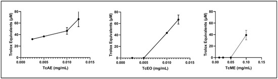 The data is presented in Figure 4. Revealed the measured antioxidant activity of the methanolic, acetonic extracts, and EO of T. capitatus by ORAC assay. The results demonstrate that the highest antioxidant assay was observed in the TcLEO and TcLAE (about 5347 µmol Trolox Equivalent (TE)/mg of the sample), and the lowest antioxidant activity was observed in TcLME (400 µmol TE/mg of extract).