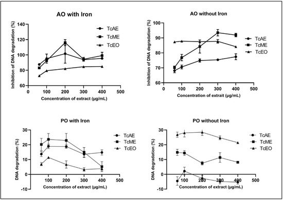 As can be seen in Figure 5 (PO without iron), no prooxidant effect was observed in the acetonic extract. The results revealed no DNA degradation for concentrations ranging from 150 to 400 mg/mL (negative values for DNA band degradation). However, for the methanolic extract and EO, there was important degradation of the DNA bands, which proved the prooxidant effect. The same thing occurred for the prooxidant activity with iron; all the extracts tested degraded the DNA bands (PO with iron).