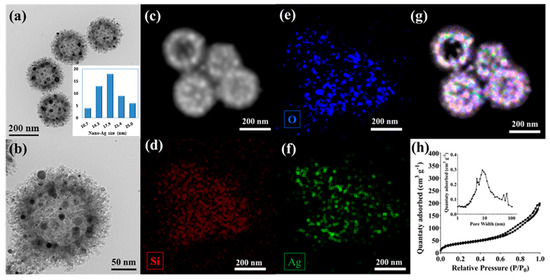 TEM images (a,b), with nano-Ag particle size distribution as inset of (a), dark field image (c), corresponding elemental mapping on silicon (d), oxygen (e), silver (f), Si-Ag-O merged image (g), and nitrogen sorption isotherm and (h), inset of pore size distribution for SiNPs-Ag.