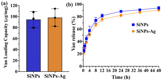 Vancomycin loading capacity (a) and release profile in PBS (b) for SiNPs and SiNPs-Ag. Error bars represent standard derivation (n = 3).