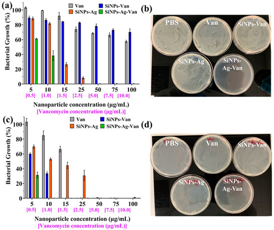 The loading of nano-Ag did not significantly alter the physicochemical features of silica nanoparticles, providing an abundant surface area and large pore size to accommodate another antimicrobial agent. It was reported that the rough-structured hydrophilic silica nanoparticles showed a relatively hydrophobic surface property, which favored the loading and slow release of vancomycin [19]. The silica nanopollens used in this study shared similar structure and hydrophobic surface properties, as reported in the literature [34], which explains the efficient loading and sustained release profile as shown in Figure 2. The efficient delivery of two antibacterial agents was achieved using pollen-like silica nanoparticles. It was reported that such a rough-structured nanoparticle surface enhanced its adhesion towards bacteria, boosting the local release of cargos. Meanwhile, the surface charge of nanoparticles was also important for bacterial interactions. The surface charge of SiNPs was measured as negative (−16.3 ± 1.7 mV), but was positive (4.9 ± 1.1 mV) after the positively charged nano-Ag loading. By the loading of a cationic antibacterial drug, vancomycin, SiNPs-Ag-Van showed a surface charge of 8.9 ± 0.9 mV, which could also promote their attachment to the negatively charged bacterial surface. Typically, vancomycin is more active against Gram-positive strains when compared to Gram-negative strains, where the outermost cell wall of the peptidoglycan is the major target of vancomycin [16]. In contrast, nano-Ag showed a broader spectrum of bacterial killing, possibly due to its many bacteria-killing mechanisms. This is reflected in the bacterial inhibition results, as shown in Figure 3a,c.