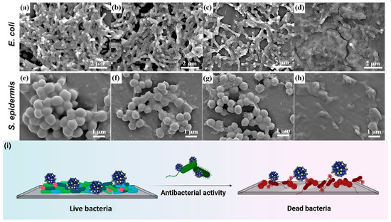 SEM images of E. coli (a–d) and S. epidermidis (e–h) after treatment of vancomycin (a,e), SiNPs-Van (b,f), SiNPs-Ag (c,g) and SiNPs-Ag-Van (d,h), and schematical illustration of the antibacterial activity (i).