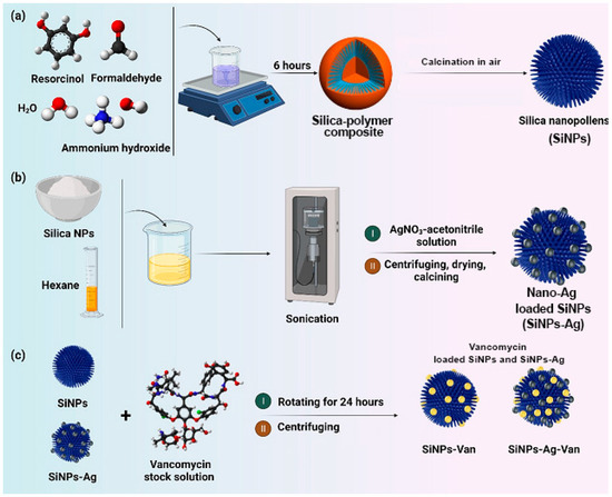 Schematic presentation of the fabrication of silica nanopollens (a), decoration of nano-Ag (b), and loading of vancomycin in the nanopollen particles (c).