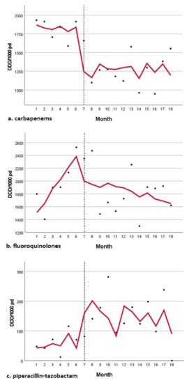 Time series analysis of antibiotic consumption. (a) carbapenem (b) fluoroquinolones (c) piperacillin-tazobactam.