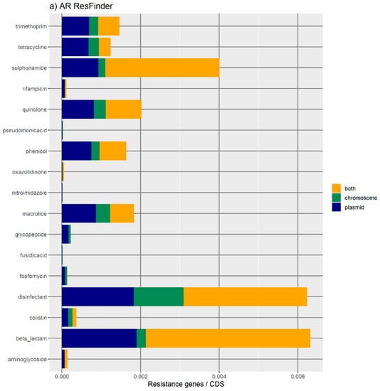 Figure 1 represents the distribution of the normalized number of antibiotic resistance gene orthologues per antibiotic class. According to ResFinder (Figure 1a,b), the largest amount of ARs belong to the category of beta-lactamase, sulphonamide, quinolone, macrolide, phenicol, trimethoprim, and tetracycline, which are present in the chromosome, plasmids, or in both chromosomes and plasmids belonging to the same bacterial genome. We also found large amounts of disinfectant-resistant genes. Of note, no fosfomycin, nitroimidazole, pseudomonicacid, or glycopeptide orthologues were found in the ‘both’ location. Interestingly, most orthologues for disinfectant resistance also appear to be preferentially encoded in the bacterial mobilome (here represented by the plasmids and ICE). Figure 1b represents the relative number of AR orthologues per genomic location.