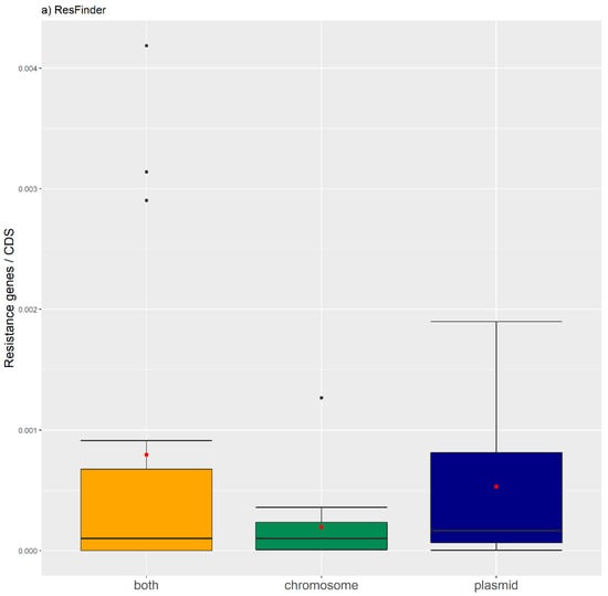 We have also generated boxplots of the antibiotic resistance orthologues per CDS for each genomic location (Figure 2). The boxplots do not show significant differences in the relative frequencies of ARs between the different genomic locations. The Kruskal–Wallis test was conducted to examine the differences between the relative number of antibiotic resistance orthologues according to the three types of genomic location. No significant differences were found (ResFinder: Chi square = 50.00, p-value = 0.2815, df = 16; and MUSTARD: Chi square = 116.42, p-value = 0.05838, df = 40).