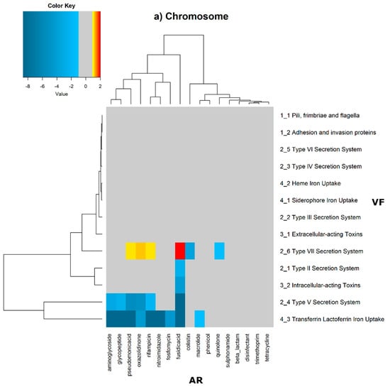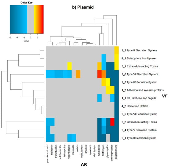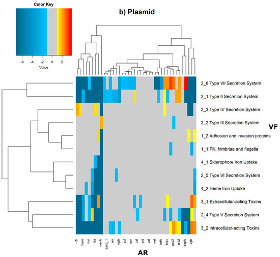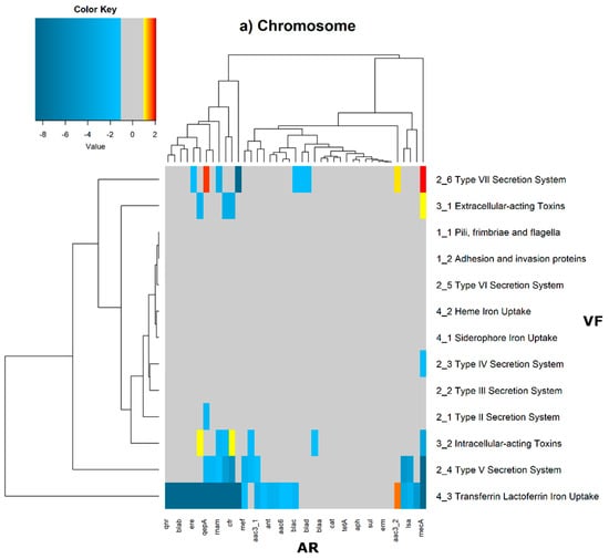 In order to evaluate the distribution of the co-occurrence of each of the antibiotic resistance gene categories and the virulence gene categories in the genomes used in this study, we constructed a contingency table. Each field of the contingency table contains the number of genomic elements containing orthologues from each of the AR and VF categories. These counts were made for all the AR and VF categories’ combinations. Next, we generated a matrix containing the expected values of counts for each of the previous combinations. They are the product of the orthologous counts of each of the AR and VF categories in all genomes, divided by the total number of counts. Finally, we have computed the Log2 of the quotient of each observed value by the respective expected value. Heatmaps, as represented in Figure 6 and Figure 7, were generated for the co-occurrences between all classes of ARs and VFs. Values in each position of the matrix that are greater than zero represent the genomes for which there are a higher number of co-occurrences between ARs from a given category and VFs from another category than expected at random and may mean that there is co-selection of these two genetic determinants. Conversely, a value below zero means that co-occurrence between a given AR category and another given category of VF is rarer than what would be expected to happen by chance, perhaps due to counter-selection. However, we have only considered as relevant those that are above 1 (represented in the yellow to red color shades) or below −1 (represented in blue shades). For these calculations, we have considered that each protein of the dataset can be classified into different AR or VF categories. With this choice, we are assuming that the same protein can belong to different antibiotic resistance mechanisms. An example of this is proteins that are part of the efflux pumps that perform the nonspecific extrusion of antibiotics belonging to different classes.