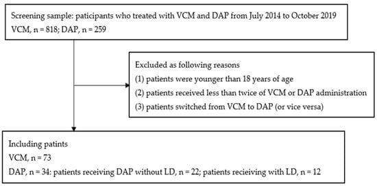 Flow diagram of study participants. DAP, daptomycin; LD, loading dose; VCM, vancomycin.