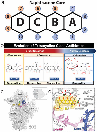 - Batool, Z.; Lomakin, I.B.; Polikanov, Y.S.; Bunick, C.G. Sarecycline interferes with tRNA accommodation and tethers mRNA to the 70S ribosome. Proc. Natl. Acad. Sci. USA 2020, 117, 20530–20537. [Google Scholar] [CrossRef]