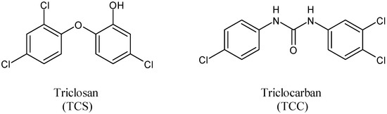 Triclosan (TCS), along with its congener triclocarban (TCC) (Figure 1) [1], is one of the most widely used antimicrobial ingredients in several pharmaceuticals and personal care products (PPCPs), such as toothpastes, facial cleansers, deodorants, soap bars, textiles, medical devices, and plastic cutting boards [2]. It was also found in contaminated food, such as seafoods [3]. TCS, namely 5-chloro-2-(2,4-dichlorophenoxy)phenol or 2,4,4′-trichloro-2′-hydroxy-diphenyl ether, is an ether whereas TCC belongs to the diarylureas family [4,5]. Despite their different chemical structures, TCS and TCC are often mentioned together as these compounds are small molecules sharing three chlorine atoms in their structures [6].