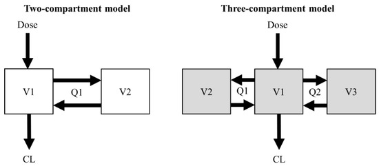 Two- and three-compartment population PK models of vancomycin were used for the simulation of the virtual concentration–time profiles [12,13]. The structural PK parameters for the two-compartment model were total clearance (CL), central volume of distribution (V1), peripheral volume of distribution (V2), and intercompartmental clearance between V1 and V2 (Q1). The structural PK parameters for the three-compartment model were CL, V1, volume of distribution for the first peripheral compartment (V2), Q1, volume of distribution for the second peripheral compartment (V3), and intercompartmental clearance between V1 and V3 (Q2) (Figure 1).