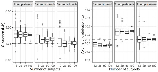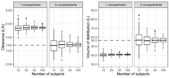 We determined the effect of the number of compartments on the prediction of the PK/PD index due to the usual limitation in the number of samples while excluding other factors as much as possible. There was no need to estimate the covariates in the stage of estimating model parameters because they were fixed at the median in the previous simulation stage. Because studies that develop a population PK model include a diverse number of subjects, we also tried to understand the effect of the number of subjects on parameter estimation. In the simulation stage, the parameters with individual differences were generated within the two standard deviations (SDs). As a result, regardless of the number of subjects, the median value of the parameter estimates of 200 datasets were almost the same. When one set is a dataset of 12 subjects, it would have been greatly affected by outliers outside of the two SDs. However, as shown in Figure 2 and Figure 3, even if it is generated within the two SDs, when the number of subjects is small, it is highly likely that the parameter estimate is different from the value used for simulation. The accuracy and precision of the population PK/PD parameter estimates are affected by various factors, including the sample size of patients, the number of measurements per patient, sparse or intensive sampling design, the degree of the BSV, and the magnitude of the within-subject variability (WSV) [5,26]. For a one-compartment model with first-order absorption, the sample size required to estimate the absorption rate within a precision level of 20% for a 95% confidence interval and a power of 90% was 30 for a sparse three-sampling scheme and 20 for a dense six-sampling scheme [27]. When testing a hypothesis using a one-compartment PK model, the sample size increases from 28 to 416 as the BSV increases from 20 to 80% for a power of 80%, mean difference of 20%, and WSV of 10% [28]. Although covariates were excluded from the analysis in this study, it should be noted that a larger number of subjects are required for studies that include covariates [29].