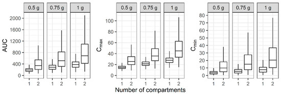 For the three-compartment PK profile, the AUC, Cmax, and Cmin of the reduced one- and two-compartment model showed smaller values compared to the three-compartment model (Figure 5). When a regimen of 1 g IV infusion over 1 h every 12 h was administered, the median AUC of the one-, two-, and three-compartment models was between 400 and 600, while the median Cmax demonstrated large differences between the models.
