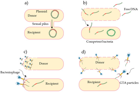 Antibiotic resistance transport mechanisms; (a) Conjugation, (b) Transformation, (c) Transduction, and (d) Gene transfer agents (GTAs), (adapted from [34]).