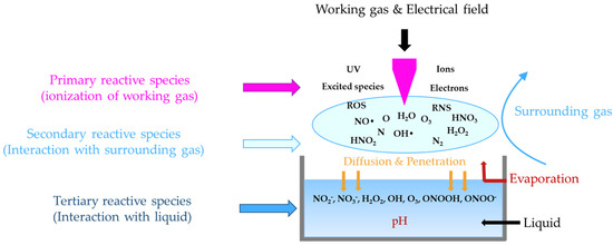 Non-thermal atmospheric pressure plasmas (NTAPPs) have attracted considerable interest for decades because of their rich chemistry [56,59,60,61]. When a non-thermal plasma is generated, the energy of the electric field accelerates free electrons and ionizes the atoms and molecules of the gas, releasing various reactive species including oxygen species (ROS) and nitrogen species (RNS). These species are called the primary reactive species. They are characterized by very short lifetimes; for example, the lifetimes of OH, NO, and O2− * radicals are 2.7 µs, 1.4 µs, and 1.3 µs, respectively [56]. Because of their high reactivity, some of these primary reactive species react immediately with the surrounding gas to create secondary reactive species. The reactive oxygen and nitrogen species (ROS and RNS) produced in the plasma phase and the plasma–liquid interface reach the target, such as a liquid, and are dissolved, forming tertiary reactive species including H2O2, O3, NO2, and NO3. These reactive species have very long lifetimes, from a few milliseconds to several days. Upon contact with a liquid, more reactive species are produced such as ONOO−, ONOOH, NO2−, NO3−, and H2O2, resulting in a decrease in the pH of the target liquid of up to 2 pH values. Figure 2 shows a schematic of the formation of ROS and RNS in the discharge region, the plasma phase, the plasma–liquid interface, and inside the liquid target [61].