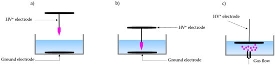 Several plasma sources, including corona discharges, dielectric barrier discharges (DBD), and contact glow discharges, have been investigated for wastewater treatment [60,61,62,63]. They operate with different power signals (continuous wave in a wide range of frequencies, pulsed voltage signals), different electrode configurations such as plate-on-plate, plate-on-pin, or pin-on-pin, and different working gases and their mixtures such as air, helium, oxygen, and argon. In general, discharges in and on liquids can be divided into three categories: discharge above the liquid surface, discharge into the liquid, and discharge into bubbles. They have been studied by many research groups to investigate the plasma–liquid interface phenomenon. Typical electrode configurations for the three different types of discharges into and onto liquids are shown in Figure 3.