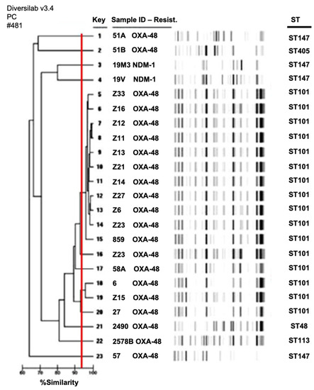 MLST analysis revealed that ST101 was the most common ST (n = 16, 69.6%) for K. pneumoniae. All these isolates harbored the blaOXA-48 gene. The other ST types identified were ST147 (n = 4), ST48 (n = 1), ST113 (n = 1), and ST405 (n = 1). Among the four ST147, two K. pneumoniae isolates carried the blaNDM-1 gene. The Rep-PCR results showed a large diversity of the isolates. Among K. pneumoniae, 11 clusters were observed (Figure 1), with a main cluster (pattern V) including 11 isolates (47.8%): Z6, Z11, Z12, Z13, Z14, Z16, Z21, Z23, Z27, Z33, and 859.