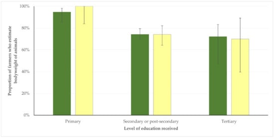 Education level of sheep (green) and goat (yellow) farmers in Greece, who calculated bodyweight for the administration of antibiotics by estimation (bars indicate 95% confidence intervals). (Correspondence of Education levels with the European Qualifications Framework Levels 1–8 are described in Table S1.)