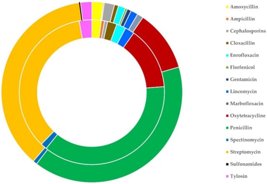 Schematic illustration of the sheep flocks (outer circle) and goat herds (inner circle) in which various antibiotics were administered in cases of pneumonia in lambs/kids, as found in a countrywide investigation in Greece.