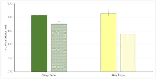 In general, there is a scarcity of relevant information internationally regarding the use of pharmaceutical products, including antibiotics, on sheep and goat farms. In a relevant study performed in Canada, Moon et al. [1] collected information from 49 sheep flocks and reported that penicillin and oxytetracycline were the two most frequently used antibiotics. Another study performed in the United Kingdom, in 26 sheep farms, focusing on the potential associations between antibiotic administration and development of antimicrobial resistance, reported that farmers engaged in preventative measures, but they deflected responsibility for reducing antibiotic resistance to veterinarians [2]. In goat farms, Landfried et al. [3] investigated the patterns of antibiotic use in 11 goat herds and found that in only four farms were antibiotics administered based on a veterinary prescription.