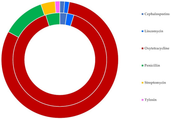 On average, 1.12 ± 0.05 antibiotics were used per flock and 1.03 ± 0.03 antibiotics were used per herd (p = 0.17). The most frequently used antibiotic was oxytetracycline (in 61 flocks, 89.7%, 37 herds, 92.5%). The frequency of the various antibiotics used is detailed in Table 7 and illustrated in Figure 5.