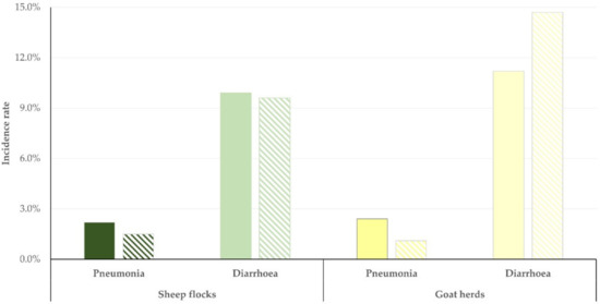 Of the 325 sheep flocks and 119 goat herds in the study, cases of diarrhoea in lambs/kids were reported in 194 (59.7%, 95% CI: 54.3–64.9%) and 69 (58.0%, 95% CI: 49.0–66.5%), respectively (p = 0.75). The annual incidence rates of lamb/kid diarrhoea in sheep flocks and goat herds were 9.6% (95% CI: 9.5–9.8%) and 13.7% (95% CI: 13.3–14.1%), respectively (p < 0.0001). Of these, treatment of the cases of the disorder was performed in 169 flocks (87.1%) and 64 herds (92.8%) (p = 0.21).