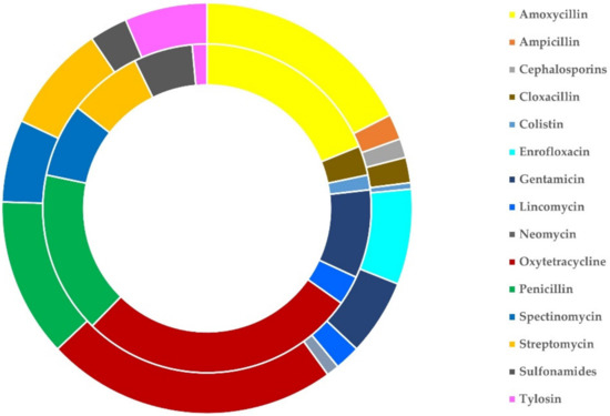 Schematic illustration of the sheep flocks (outer circle) and goat herds (inner circle) on which various antibiotics were administered in cases of clinical mastitis in Greece.