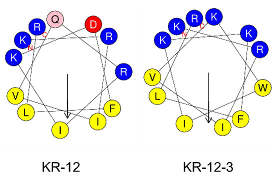 Sequence and helical wheel diagrams of KR-12 and KR-12-3. The down arrows represent the μH vector. Blue circles refer to hydrophilic residues, pink circle refers to glutamine, red circle refers to aspartic acid, and yellow circles refer to hydrophobic residues.