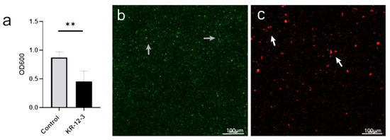 According to the biofilm susceptibility test, KR-12-3 demonstrated high activity against S. gordonii biofilm formation. The bacterial biofilms treated with KR-12-3 showed a reduced OD (Figure 2a). As shown in Figure 2b,c, in CLSM, green represents live bacteria, red represents dead bacteria, and yellow represents the proximity of live and dead bacteria. The visual field in the control group was mainly green. In the KR-12-3 group, the green area decreased and the red area increased.