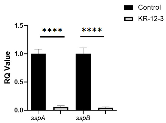 KR-12-3 significantly reduced the expression of S. gordonii adhesion genes (sspA and sspB). **** p < 0.0001 compared with control groups. The experiments were all repeated at least 3 times.