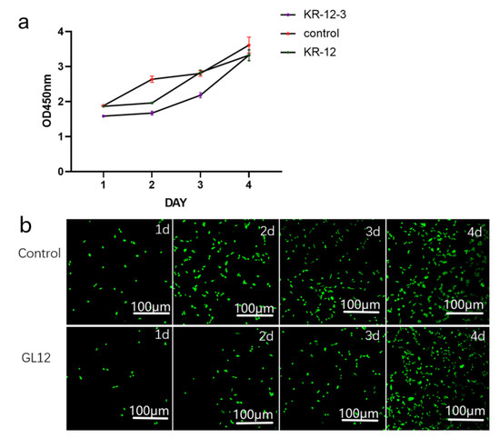 KR-12-3 and KR-12 at 312.5 µg/mL slightly inhibited MC3t3-E1 cell proliferation relative to the control group, but no significant differences were observed after longer treatment durations (Figure 5a). This was also confirmed by CLSM (Figure 5b). CLSM observation after co-culture of KR-12-3 and Mc3t3-e1 cells showed that the number of cells in the experimental group was less than that in the control group during the first 3 days, but there was no significant difference on the fourth day.