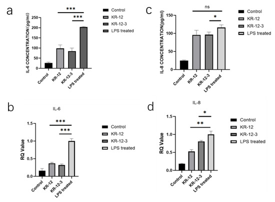 RAW264.7 cells were treated with LPS (100 ng/mL) in the absence or presence of peptides. The secretion levels of IL-6 and IL-8 were determined by ELISA. Figure 6a,c shows that LPS significantly (p < 0.01) induced IL-6 and IL-8 production in RAW cells. While 20 µg/mL of KR-12-3 significantly (p < 0.01) blocked LPS-induced IL-6 and IL-8 production, resulting in approximately 60% and 20% inhibitions of IL-6 and IL-8, respectively. The expression of IL-6 was significantly decreased after KR-12-3/KR-12 treatment at the same concentration. KR-12 reduced the gene expressions of IL-6 and IL-8 but caused only a significant reduction in IL-6 production, and there was no statistical difference in the effect on IL-8 production (Figure 6b,d). Subsequent experiments showed that both peptides induced the downregulation of the IL-6/IL-8-related gene expression.