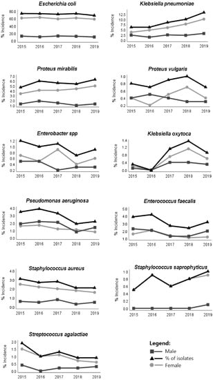 Incidence of the main bacteria implicated in UTIs by sex during the study period (2015–2019).