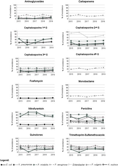 3.3. Antimicrobial Resistance Patterns of the Main Bacteria Implicated in UTI