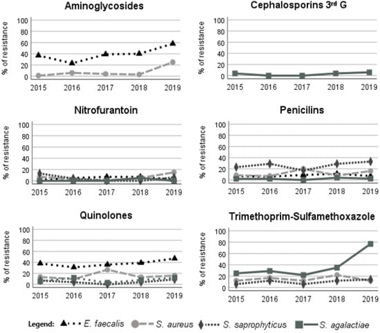 The Gram-negative isolates of E. coli showed a slight increase in resistance to amikacin and cephalosporins of the first generation throughout the years (Figure 2). Enterobacter showed increased resistance to cephalosporins of the third generation, more precisely, to cefotaxime (Figure 2). P. aeruginosa showed a slight resistance increase to aztreonam. In general, the recorded resistance to ciprofloxacin was constant during the study period, but K. oxytoca isolates showed a slight decrease. P. mirabilis and P. vulgaris showed a decrease in SXT resistance (Figure 2). The Gram-positive bacterial isolates of S. aureus showed an increase in resistance to the aminoglycosides during the study period (Figure 3). E. faecalis and S. aureus also showed a slight increase in nitrofurantoin resistance, but S. saprophyticus presented a decrease in resistance to this antimicrobial (Figure 3). E. faecalis and S. saprophyticus showed an increase in resistance to penicillins. S. agalactiae isolates were the bacteria that presented the greatest increase in SXT resistance (Figure 3). The resistance of bacteria implicated in UTIs of male patients was, in most cases, statistically different (Chi-square test, p < 0.05) from that observed for bacteria isolated from female patients, showing, in general, higher resistance in male patients (Table 2 and Table 3).