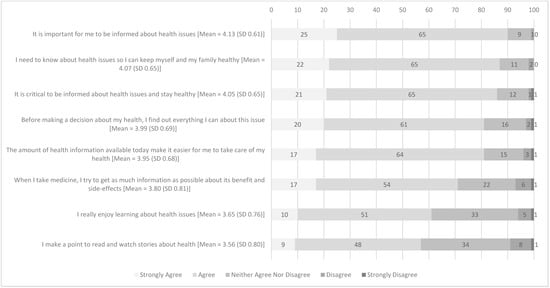 The reliability of the HIO scale was high (Cronbach’s alpha = 0.8699). More than half of the respondents agreed or strongly agreed to each of the eight statements on HIO (Figure 1). A majority of the respondents agreed or strongly agreed that “it is important for me to be informed about health issues” (90%; mean = 4.13 [SD 0.61]), “I need to know about health issues so I can keep myself and my family healthy” (87%; mean = 4.07 [SD 0.65]) and “it is critical to be informed about health issues and stay healthy” (86%; mean = 4.05 [SD 0.65]). In total, 1203 (60%) respondents had HL-HIO.